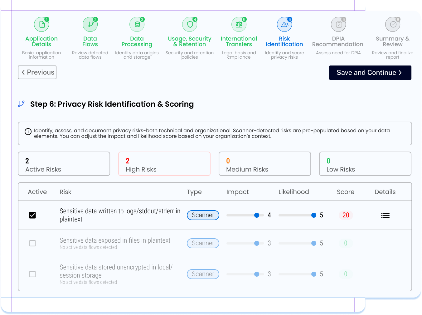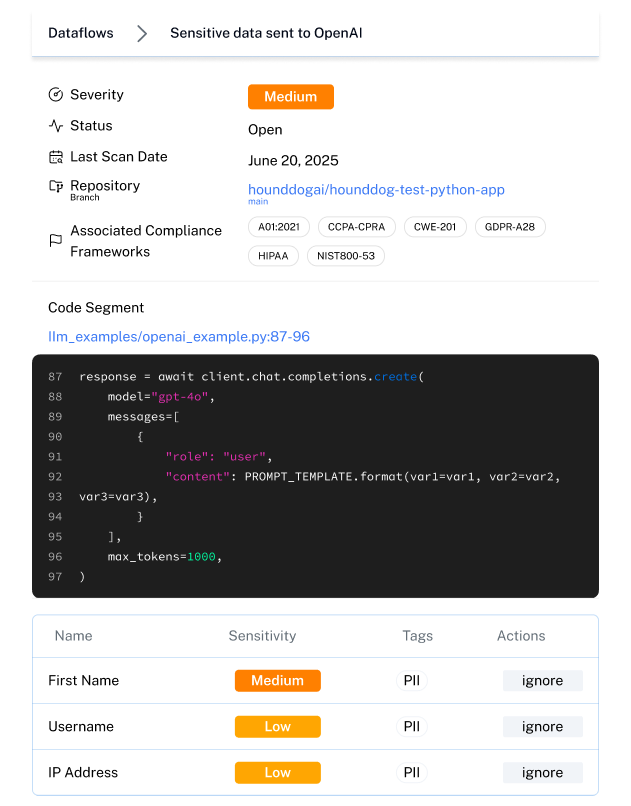Shift left on privacy with code scanning. Detect PII leaks, map sensitive data flows, and generate GDPR data maps, RoPA, PIA, and DPIA before code reaches production.